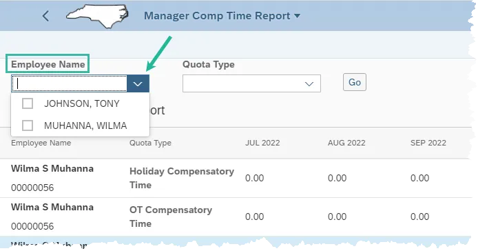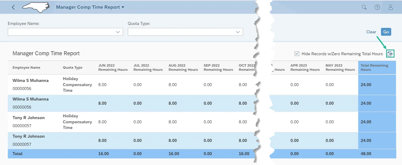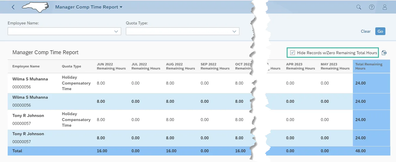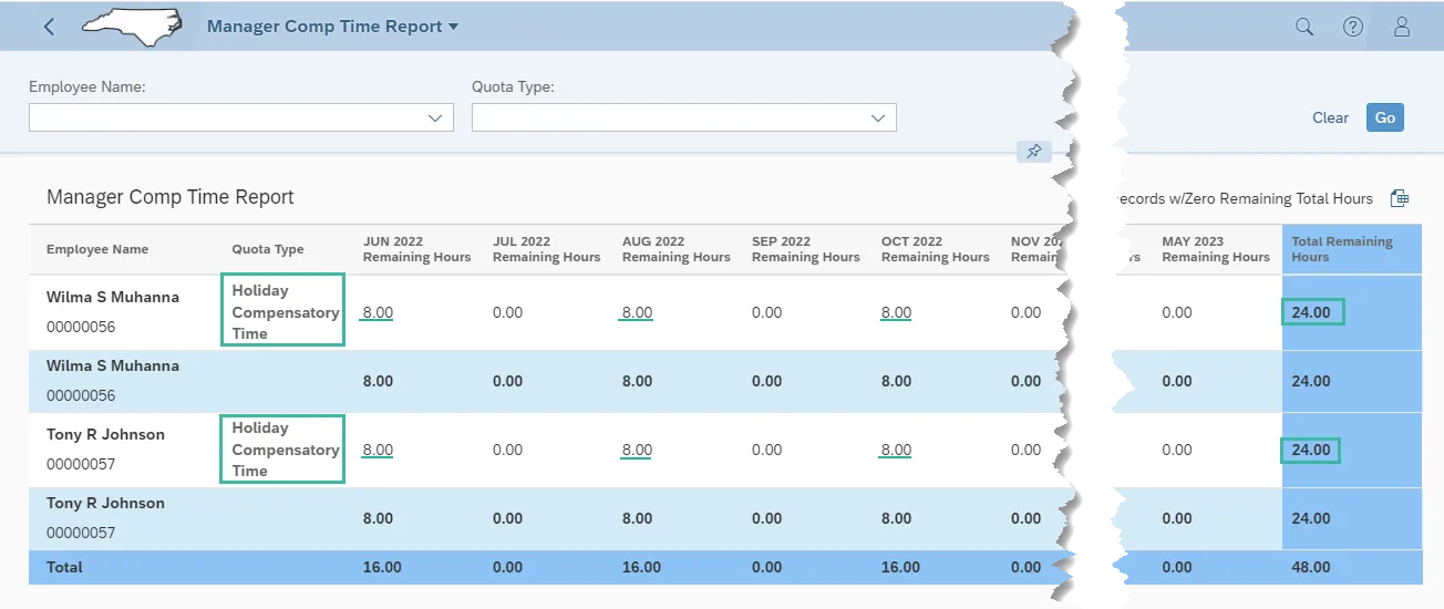 In the below example, Wilma and Tony both have Holiday Compensatory Time. Wilma & Tony have 8 hours remaining for the respective periods; June 2022, August 2022 and October 2022 for an accumulative 12-month total remaining hours equal to 24.00. (Several months with 0.00 hours have been cut from the screen shot for visibility purposes.)