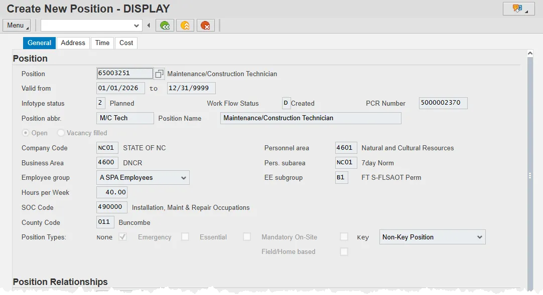 The purpose of this job aid is to define the fields that are included in the Create New Position (position action 100) screens and tabs.  The fields are listed in the order they display on the SAP screen, reading left to right from each row.