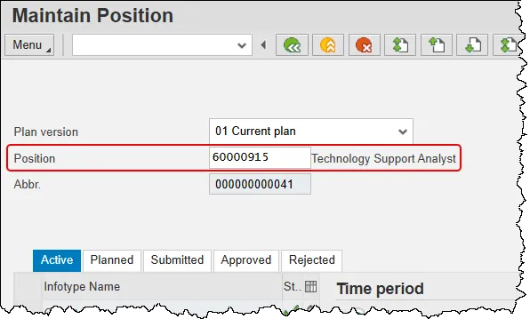 In the screenshot below, there is already an IT9023 Position Types record on the selected position – indicated in the screenshot by the green check to the right of the infotype selected.