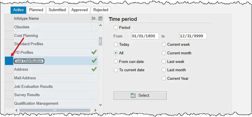 Step 4. Scroll down the list of position infotypes and click the square on the left of the Cost Distribution row.