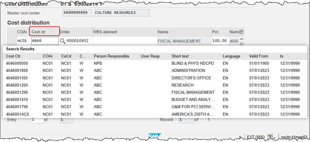 Step 8. Update the Cost Ctr (Cost Center) field as appropriate. In this example we’ll use: 4646001790. See chart at the end of this document for a description of the Cost Center field.