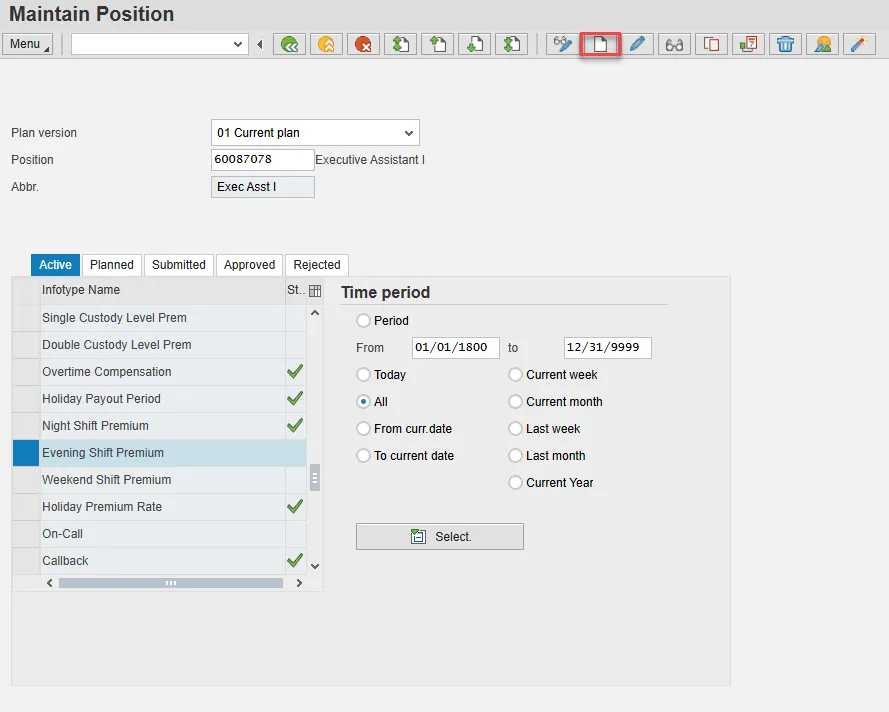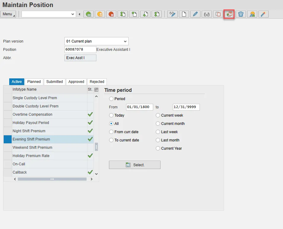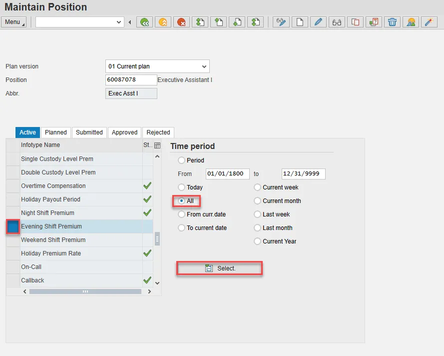 - Scroll down the list of position infotypes and click the square in front of the Evening Shift Premium row. There may or may not be a green check already present.