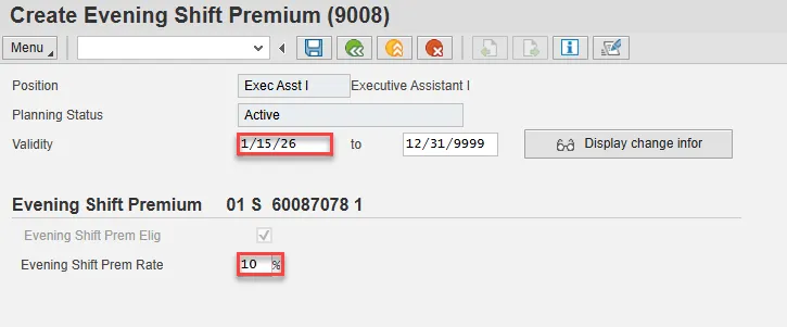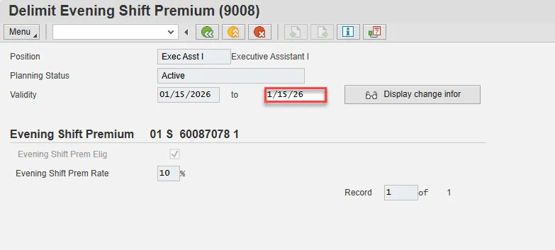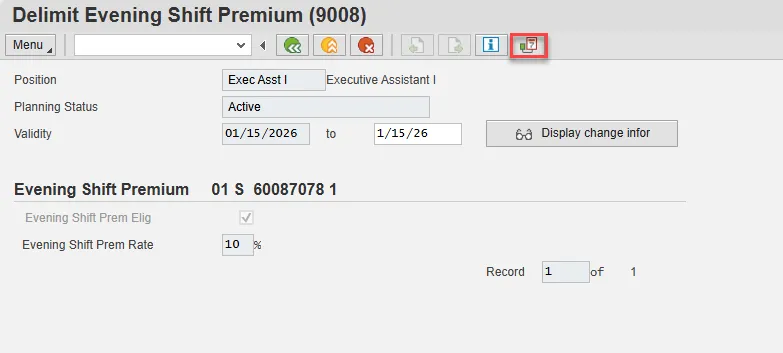 A list of all Evening Shift Premium Infotypes for the Position will be displayed, including the Validity Dates, eligibility for the premium, and the premium rate.