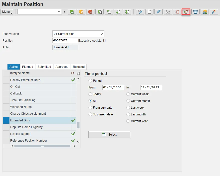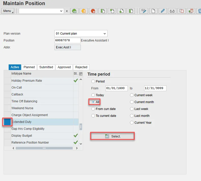 - Scroll down the list of position infotypes and click the square in front of the Extended Duty row. There may or may not be a green check already present.