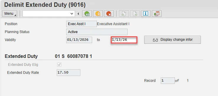 A list of all Extended Duty Infotypes for the Position will be displayed, including the Validity Dates, eligibility, and the extended duty rate.