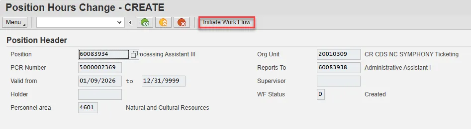 Note: Clicking the Initiate Workflow button will lock in your data and no changes can be made unless the PCR is rejected and sent back to you. Prior to clicking this button, you can make changes to your proposed data by using the Change button within the ZOMA069 transaction.