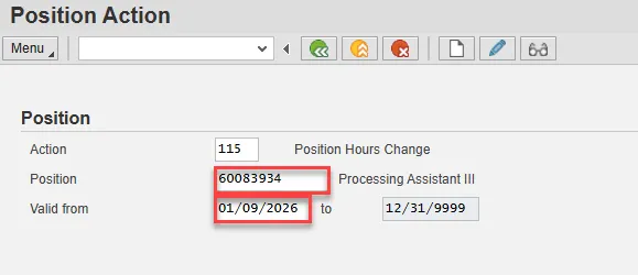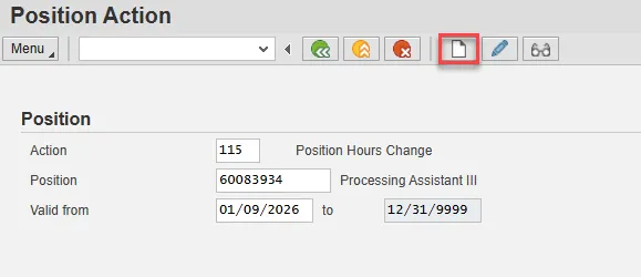 Step 2. Use action code 115 to complete a Position Hours Change action. It may be typed directly into the Action field, or you can use the Matchcode button to select it from a list of all available actions.