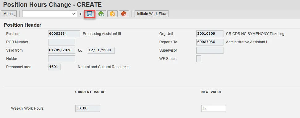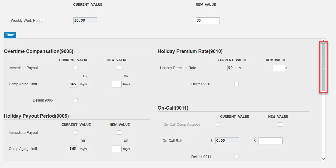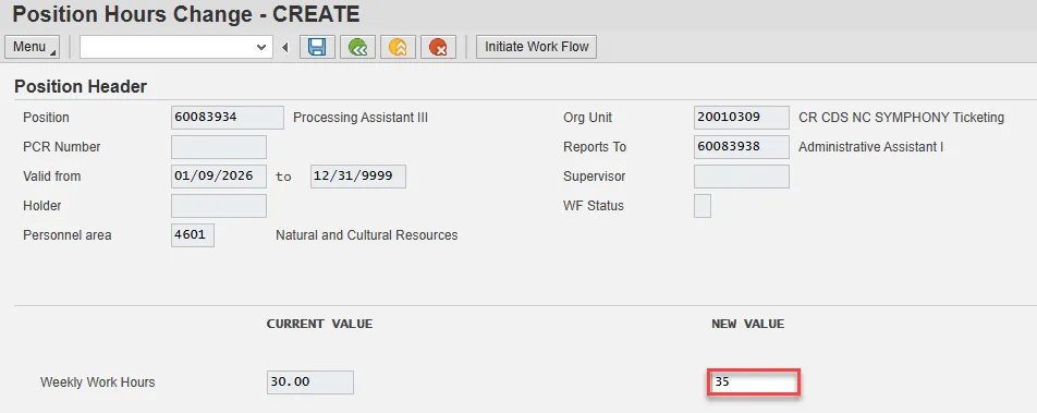 Step 7. In the New Value column, enter the new Weekly Working Hours. Remember – The new value must be less than 40 so that the position remains in a part time EE Subgroup.