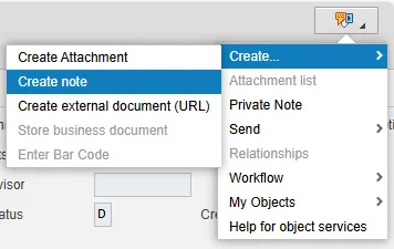 Step 12. Return to your SAP window and click the right side of the Services for Object button to access the dropdown menu. Hover over Create and then click on Create Note.