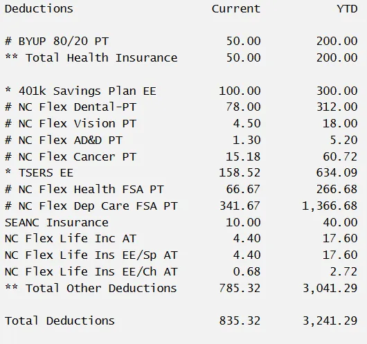 Total Deductions is the sum of total health insurance deductions and total other deductions. Each deduction may have either an * or # deduction code to the left of the deduction name: