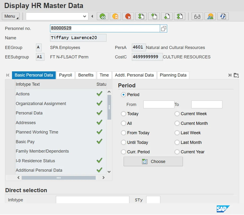 Information: Select the appropriate Infotype to display. Infotype records can be accessed through the various /Tabs/ or through the /Direct Selection/ section of the screen. Infotypes listed within the Tabs with a corresponding green checkmark indicate that he infotype records is populated with data. Infotypes without a green checkmark may not be populated at this time.