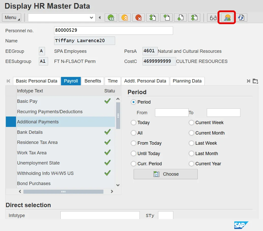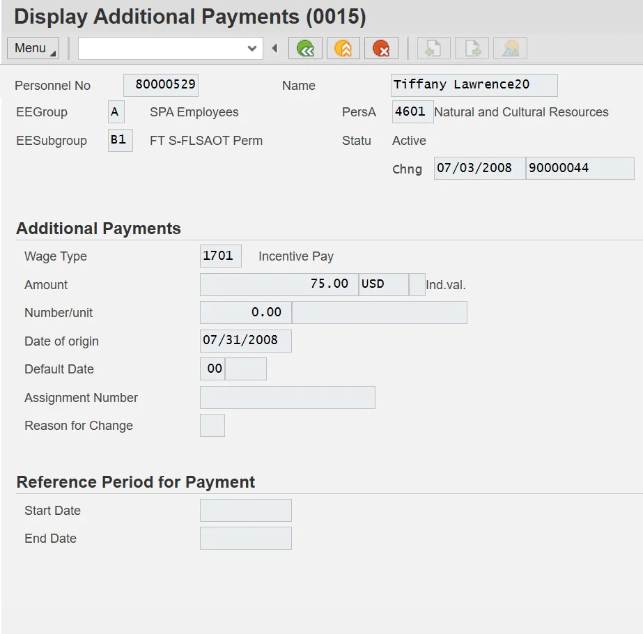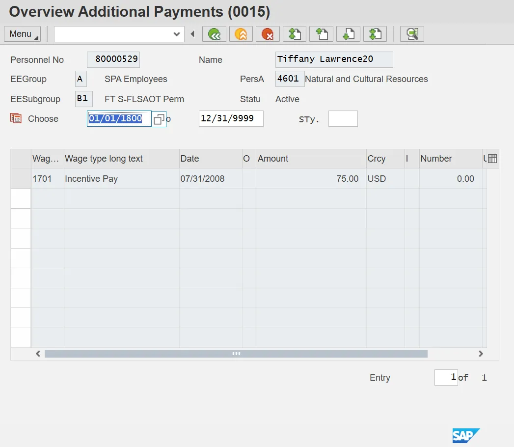 Information: Review the Additional Payments data as appropriate. There may be multiple records for infotype 0015, available by clicking on the next record. If there are multiple records on the screen, additional data is available by selecting those records.