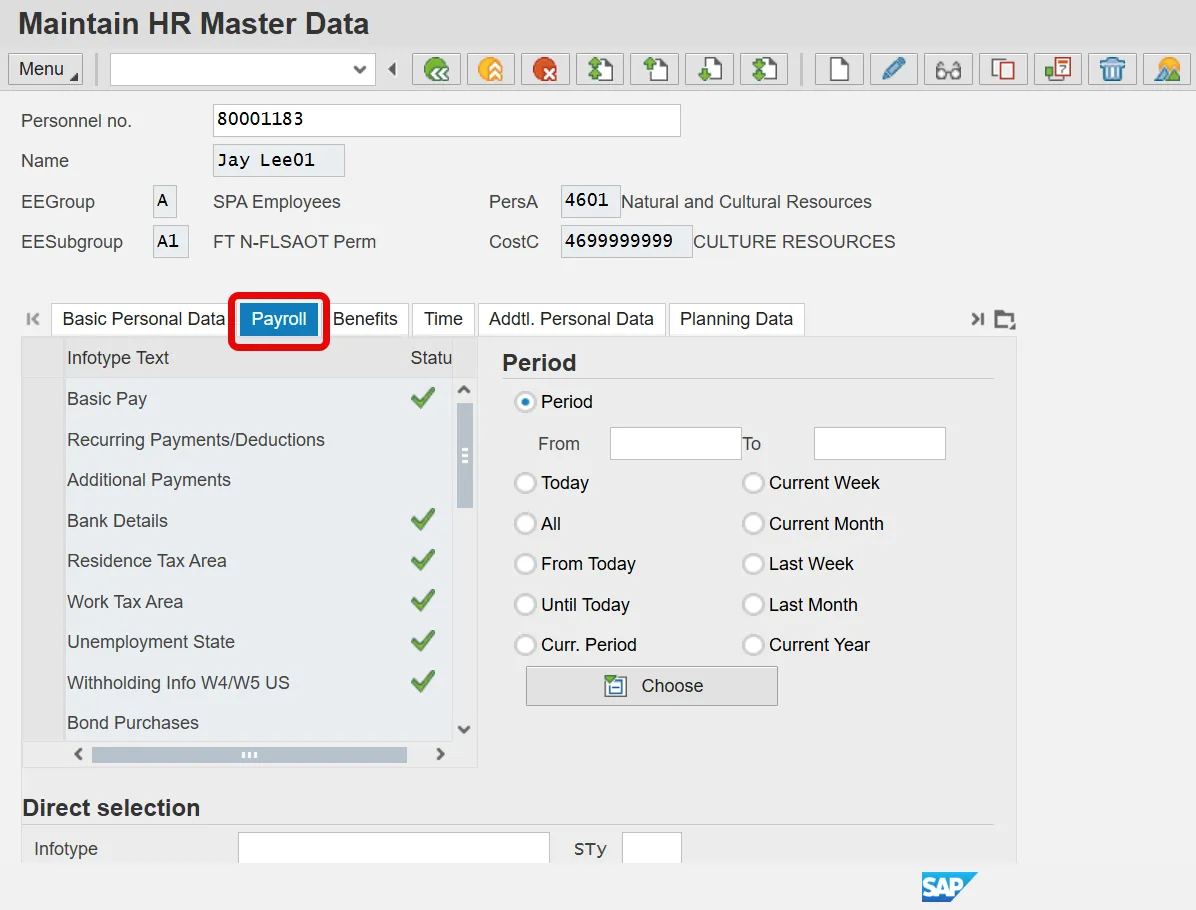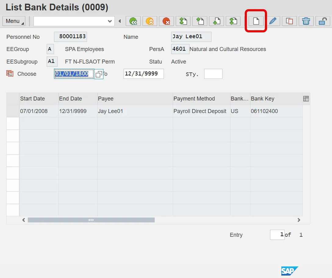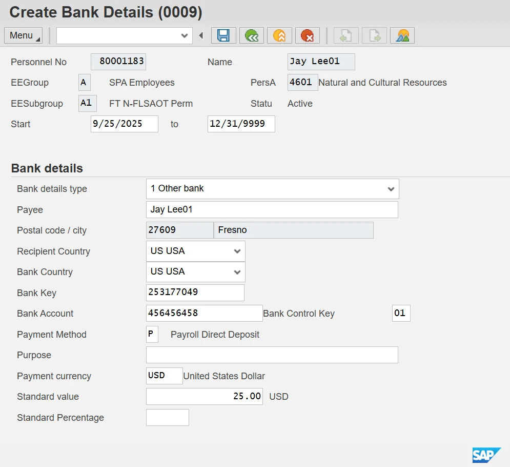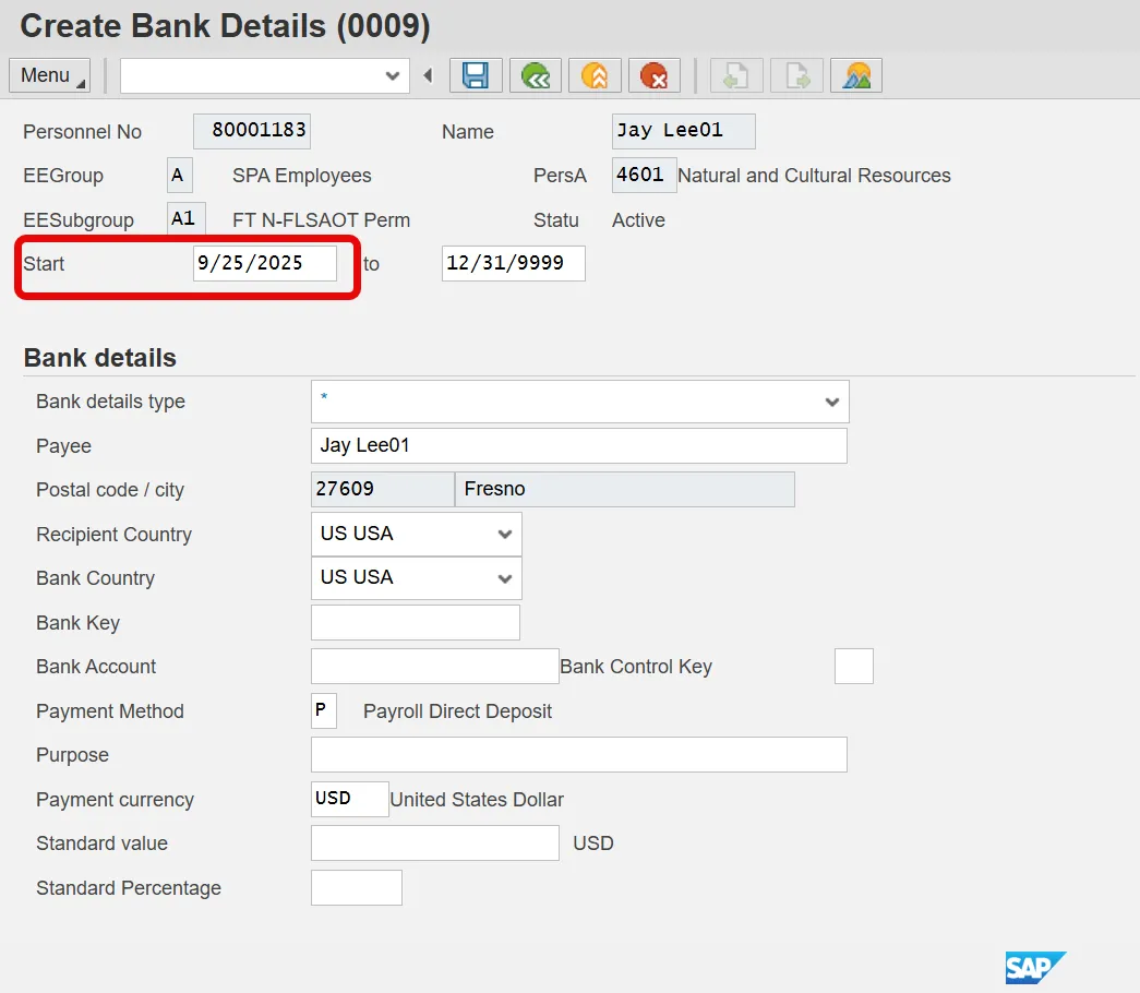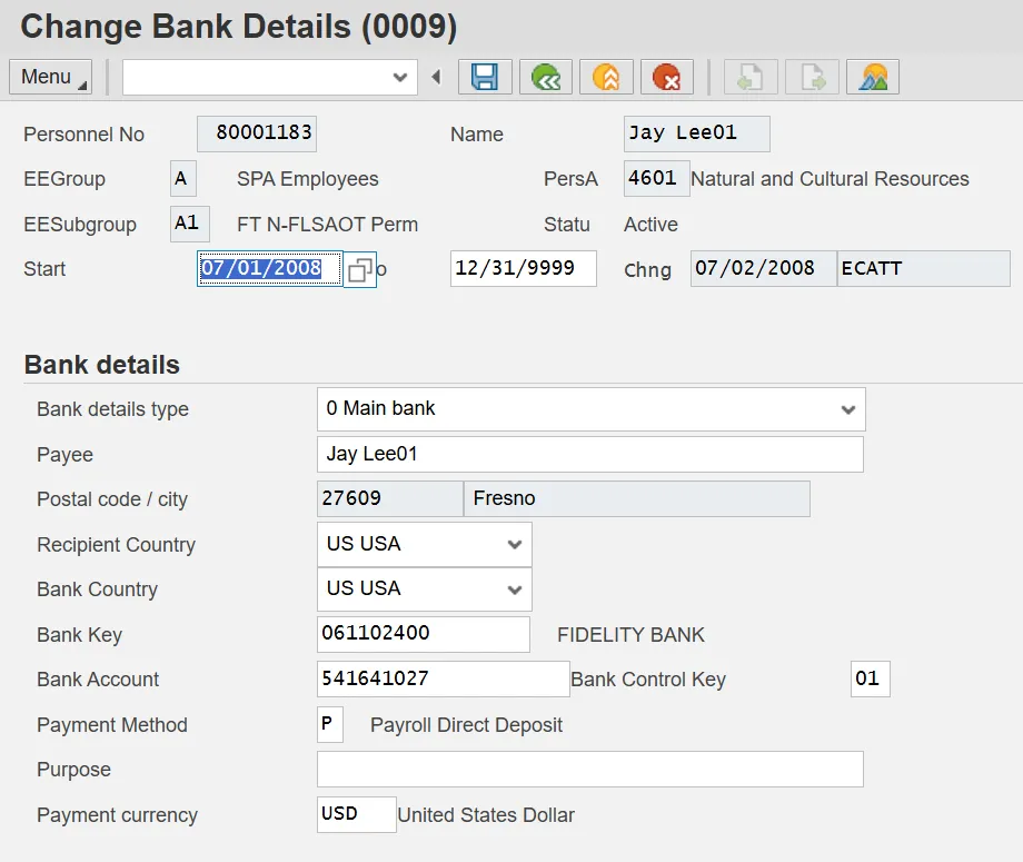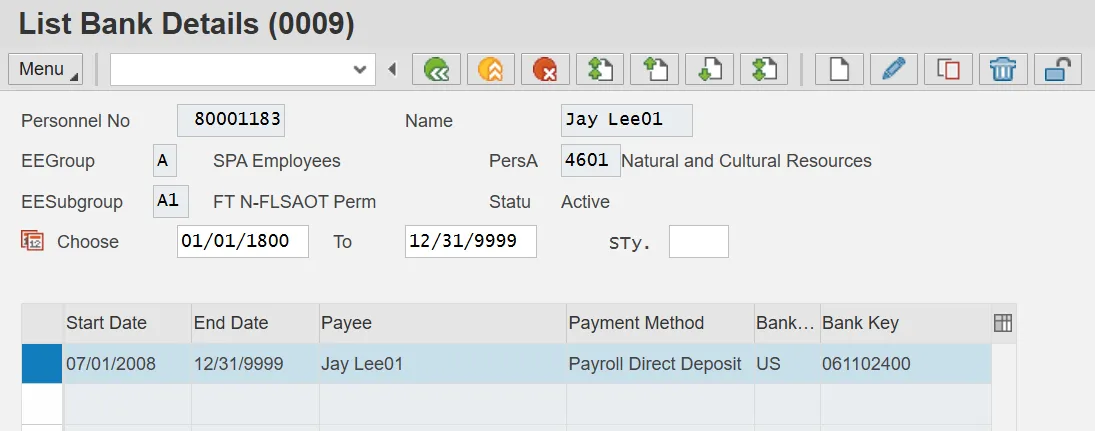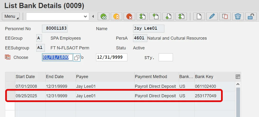 CRITICAL! Any change made to the bank must be made on the first day of the payroll period (monthly or biweekly). This includes changes being made through transaction code PA30 and FIORI as an end user. If a change is made in the middle of the payroll period, the payroll process will pick up both records as valid for the entire payroll period.