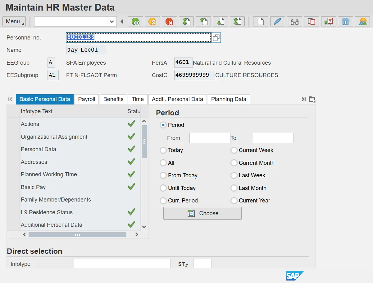 Infotypes listed within the Tabs with a corresponding green checkmark indicate that the infotype records are populated with data. Infotypes without a green checkmark may not be populated at this time.