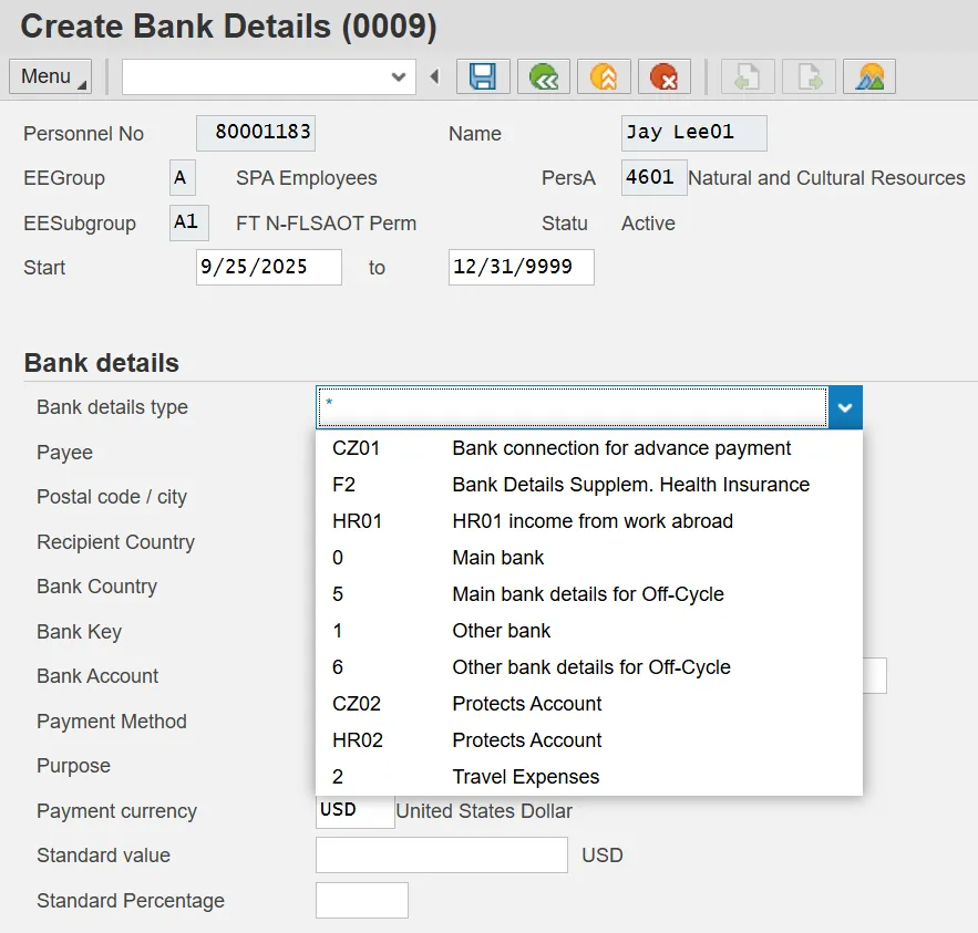 Information: Each employee must have one Main bank detail entered in IT0009. An employee may have up to three Other bank details entered. An employee does not have to have a travel expense bank detail type. Employees that may receive an accounts payable reimbursement are encouraged to enter their bank details here, or they can contact NCFS.