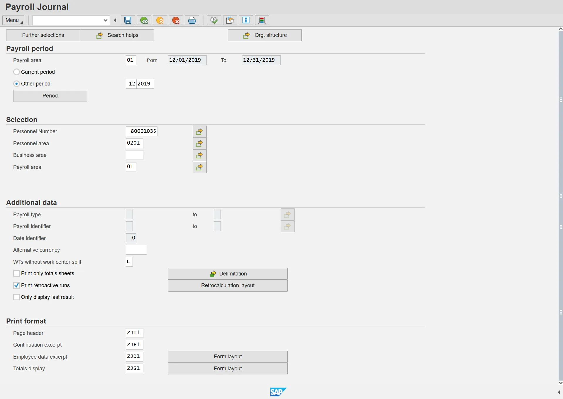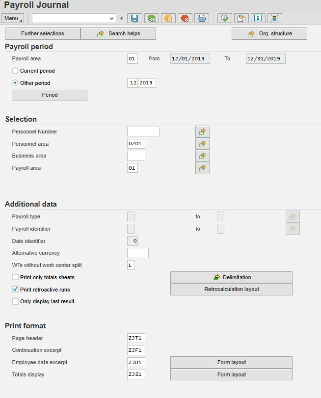 Step 8.    Click the Further selections button. Choose the selections to enter criteria to further delimit which employees are selected.