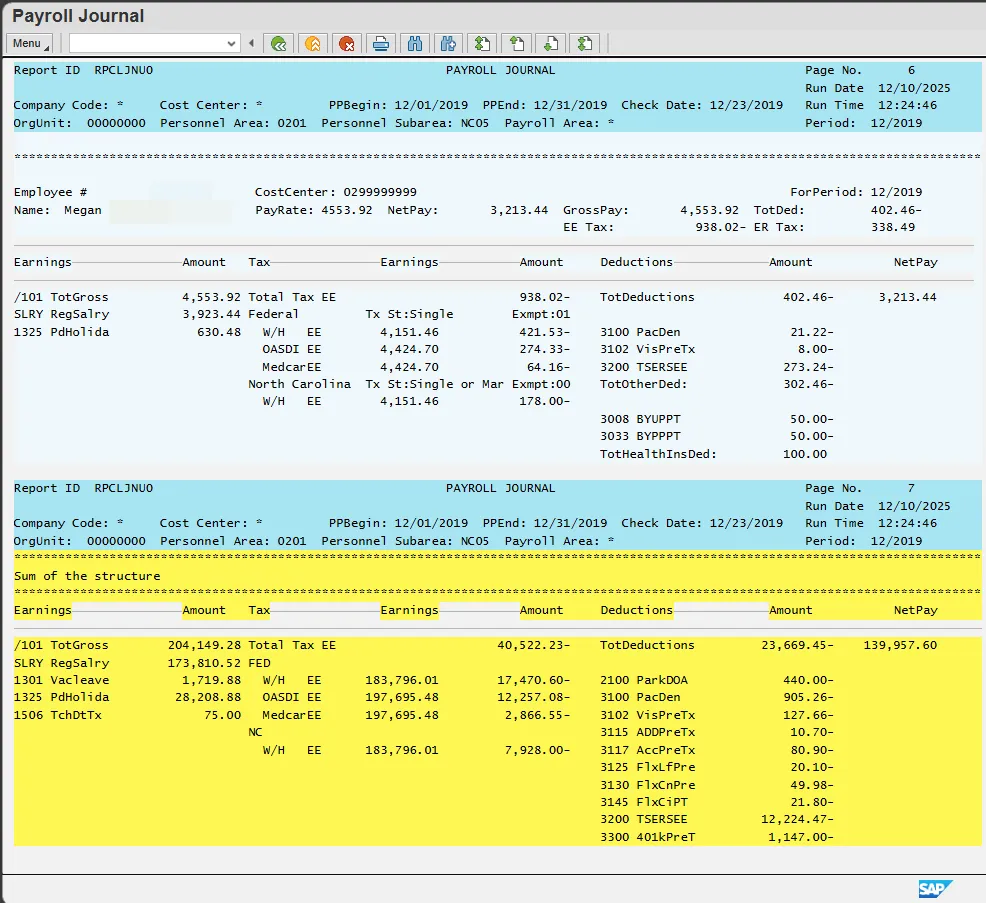 Step 19.    Click the Scrollbar to see each employee in the Personnel area. The yellow section displays the subtotal amounts for Personnel Subarea NC01.