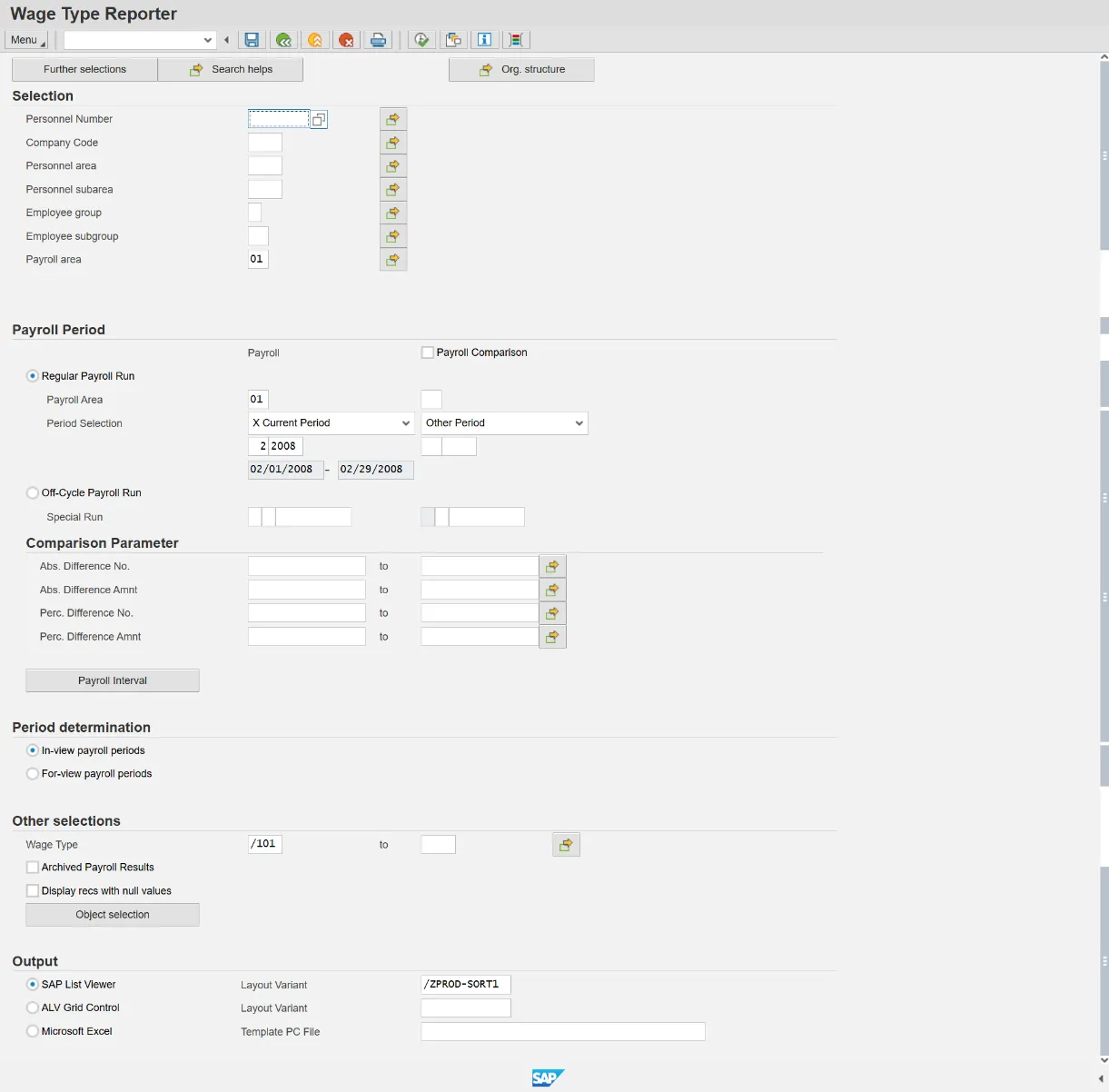The purpose of this transaction is to evaluate the wage types for a specific period and a specific payroll run. A regular payroll run can be compared with another regular payroll run using wage type reporter.