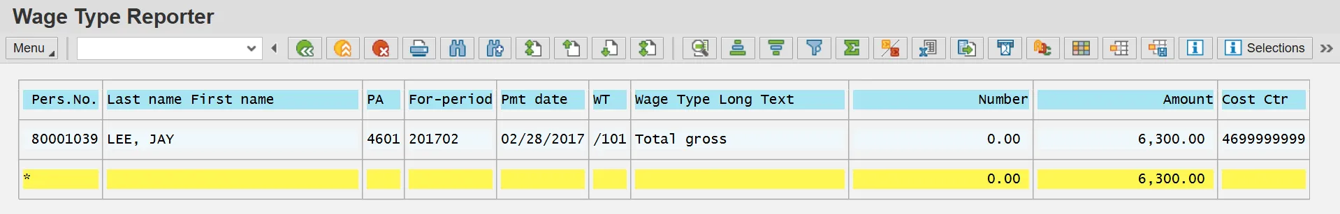 Note: This report contains the data related to Personnel Number 80001039. The variant allows you to view the total gross wages (WT /101) for the other period of 01/2017.