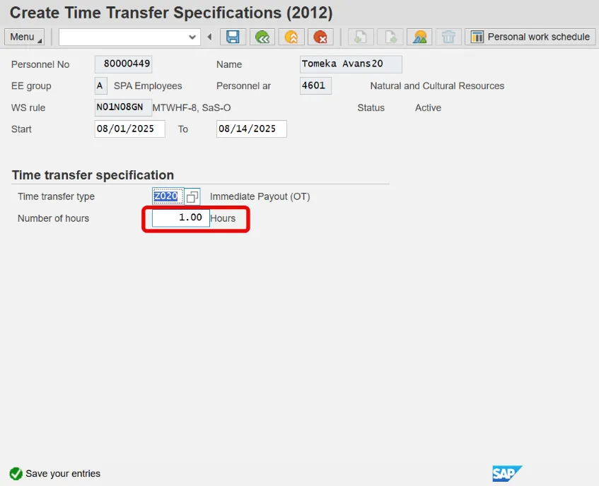 Step 7. Dates from the first screen will populate within the record. Enter 1 in Number of hours field.