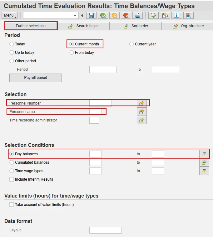 Step 2.    To search for one or more specific employees, enter the personnel number(s) in the Personnel Number field; to search by personnel area, select Further selections, and, under Selection options, double click on Personnel Area and select the green check. Enter the personnel area in the Personnel area field.