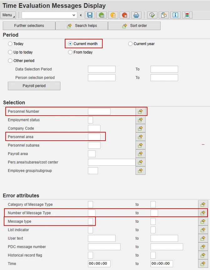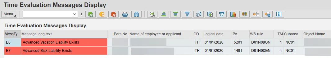 • running transaction PT_ERL00 to identify employees who have received the E6 or E7 Time Evaluation error messages, and then,