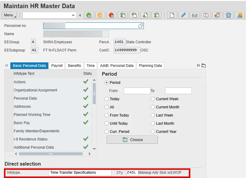 Step 2.    Enter value 2012 in the Infotype field and press Enter.  (Selecting Time Transfer Specifications from the list of infotypes is also an option.) Enter the appropriate value in the STy Field and press Enter.