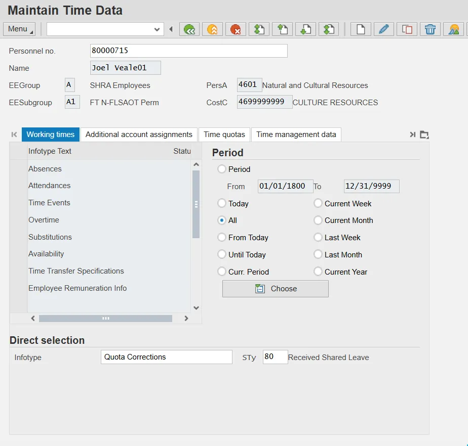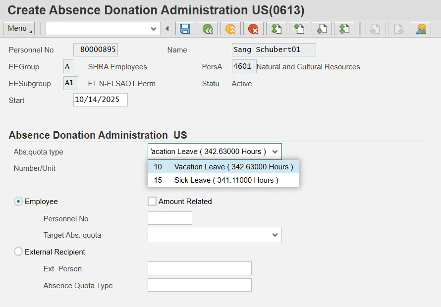 In the previous steps, the Donor employee donated 16 hours of Vacation leave. In the steps below, the donated 16 hours are shown as a quota correction (IT2013) record for the Recipient.