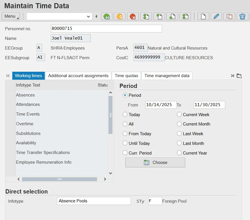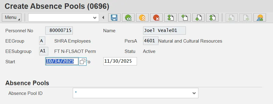 Once an employee is approved for Voluntary Shared Leave, you will create an eligibility record that enables the employee to receive leave donations using Infotype 696 (IT0696) The Absence Pool. Even though the infotype name references absence pools, the functionality in the Integrated HR-Payroll System (based on OSHR Voluntary Shared Leave policy) will allow only direct employee-to-employee leave donations. There is a single subtype of IT0696 that is relevant to Received Shared Leave eligibility: Foreign Pool (Subtype F). The Foreign Pool subtype creates a generic eligibility record for the employee.