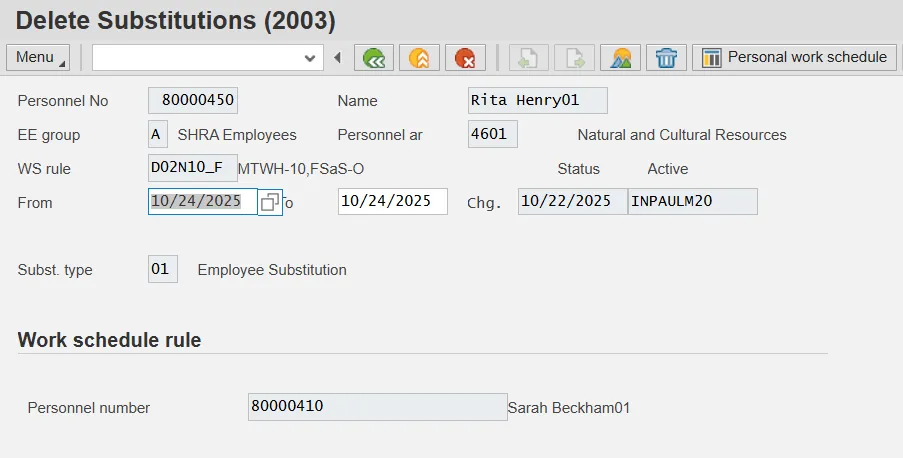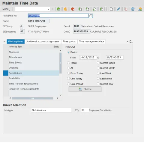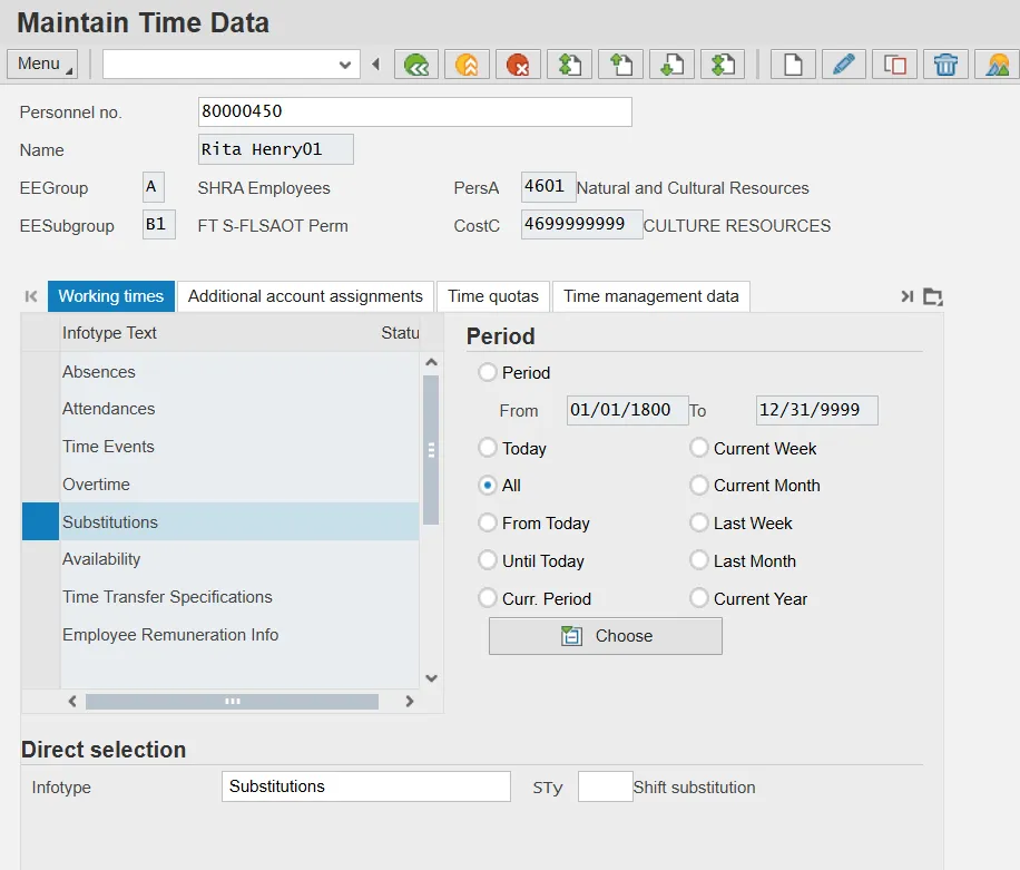 Employee substitution (subtype 01) - An employee substitution involves specifying a personnel number of the employee for which the substituting employee will be replacing during the period of the substitution record. The substituting employee will assume the planned working time and premium eligibility of the employee specified for period of the substitution record.