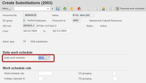 Shift substitution (subtype 02) - A shift substitution involves specifying a Daily Work Schedule (DWS) or Work Schedule Rule (WSR) that the substituting employee will work during the period of the substitution record. A DWS should be used for a substitution of a single day. A WSR substitution is more appropriate for a longer substituting period.