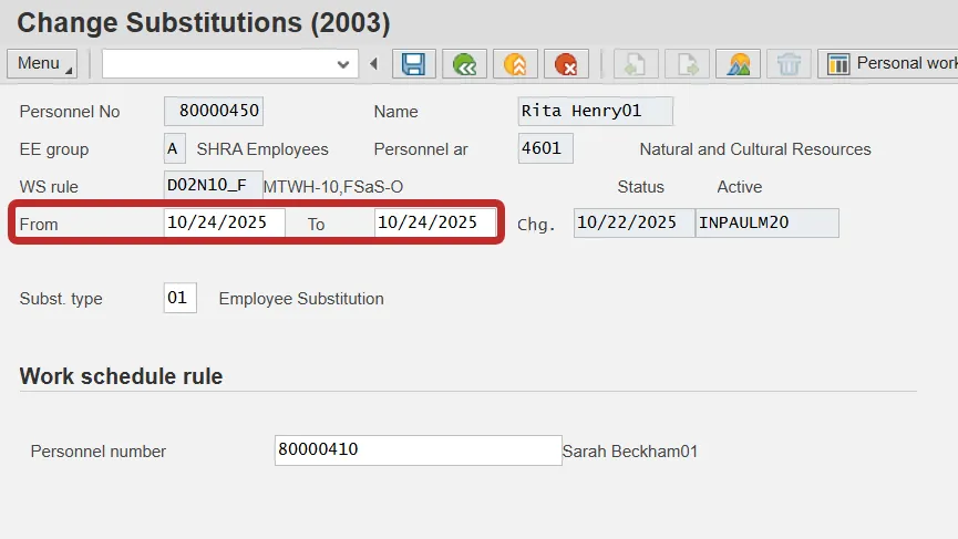 Enter the Personnel number of the employee who the current employee will be substituting for during the period identified on the substitution record.
