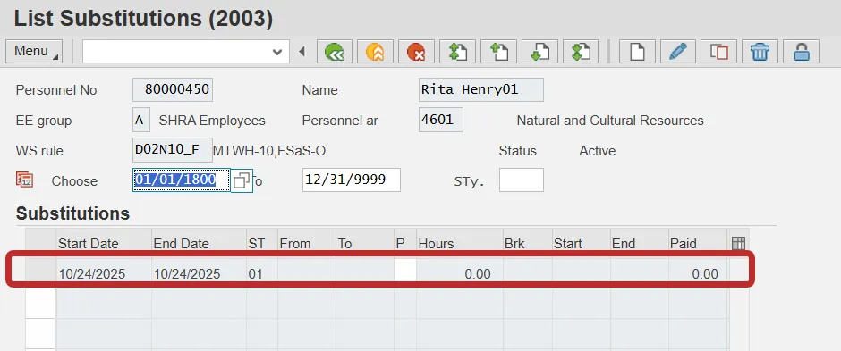 NOTE: If multiple substitution records exist for the employee, use the Next Record or Previous Record buttons to find the record to be maintained.
