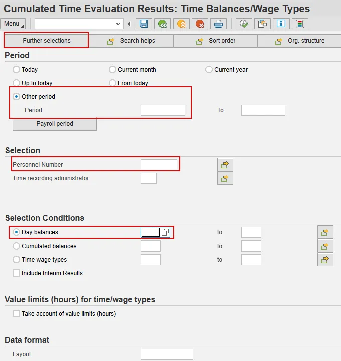 Step 4. Under the Selection Conditions section, in the Day balances field, enter Time Type 3699 (Elig Hours for OT).