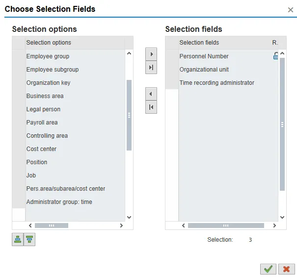 * To add the Organizational Unit field, at the top of the screen, click the Further selections button. Under Choose Selection fields, Selection Options, double click on Organizational unit. The field will be moved to the Selection fields column.