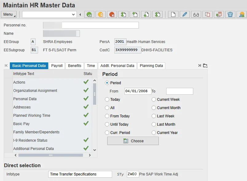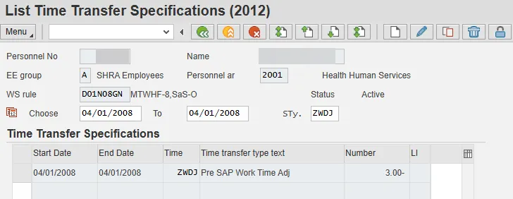 Infotype 2012 subtype ZWDJ allows agencies to adjust the time worked hours for impacted employees. This record can be a negative value if too many hours were reported, and the number needs to be reduced. The hours of time worked that were already reported on the timesheet in the Integrated HR-Payroll System have been counted, so this 2012 entry is an adjustment to add or reduce the hours. It does not replace the previous count of hours.
