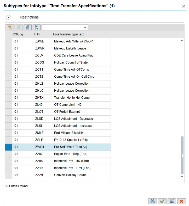 Remember: You will only be able to use Subtype ZWDJ on the date of 4/1/2008. If you did not use the date of 4/1/2008 for the Period, you will not be able to see the subtype ZWDJ on this list.