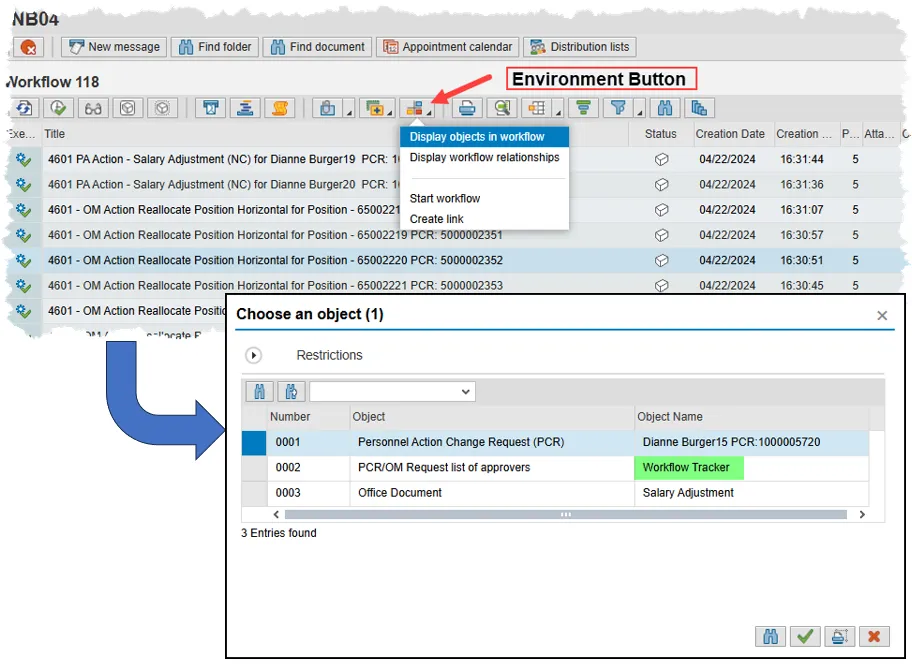To view the Tracker from your Inbox or Outbox, use the Environment button, then click Display objects in workflow in the drop-down menu. In the ensuing pop-up, simply double click the line item labeled Workflow Tracker in the Object Name column.