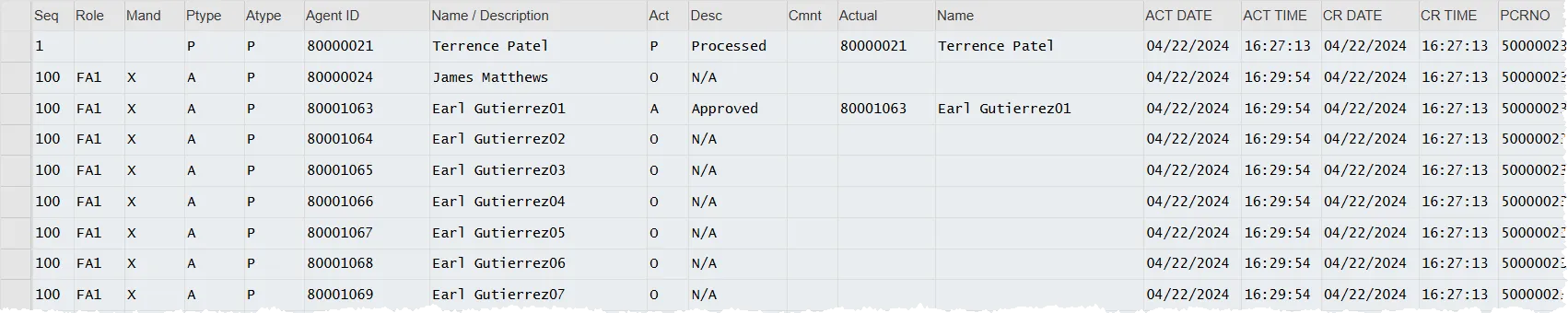 - Act – (Action) A single letter key indicating the action taken by the person listed in the Agent ID & Name/Description columns. They are described in Desc bullet item.