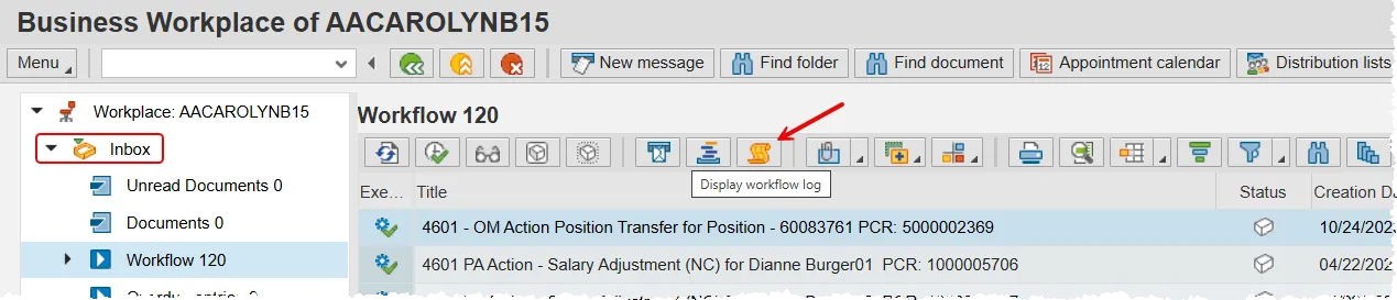 Once you have reviewed this pop-up, close it with the red X and then use the green back arrow button on the Workflow Log screen to return to the SAP Business Workplace.