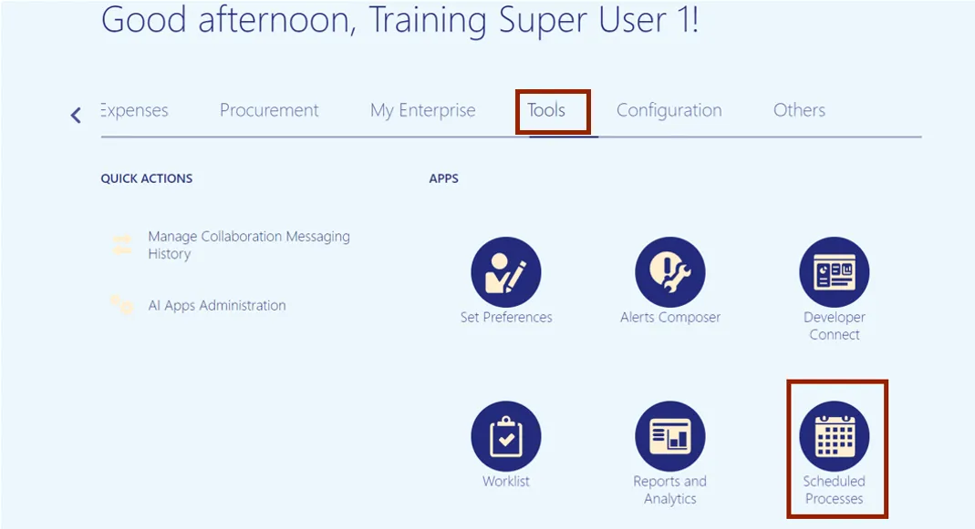 Step 2.    On the Home page, click the Tools tab and select the Scheduled Processes app.