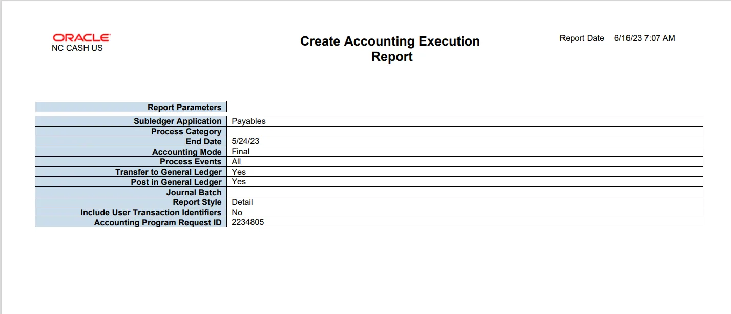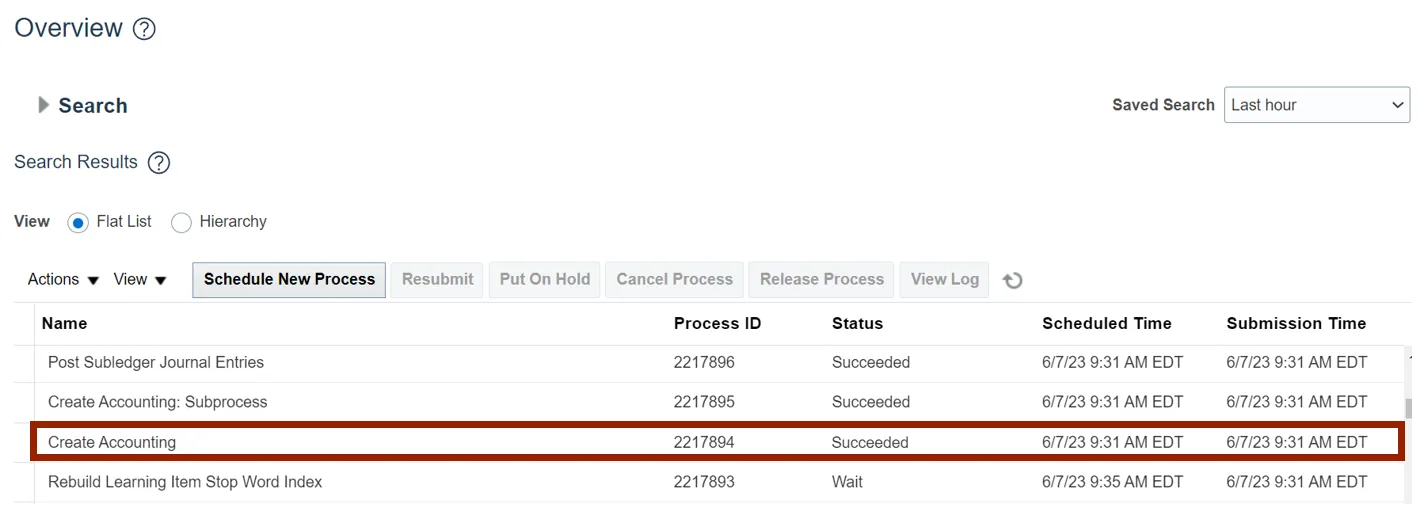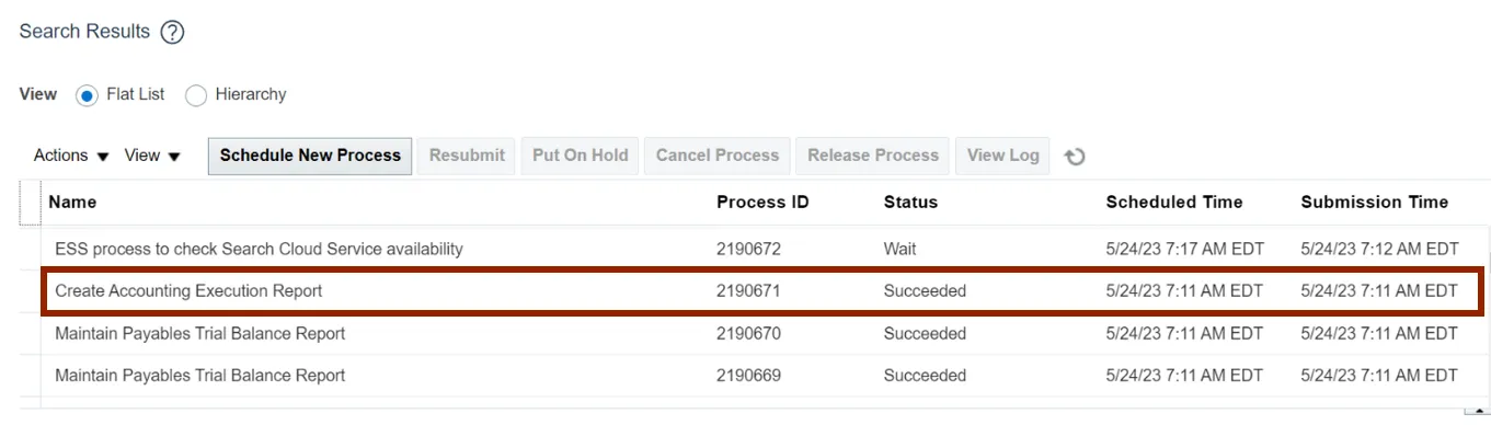 Step 12.    On the Search Result section, wait for the status to be updated as Succeeded. Click the Create Accounting Execution Report line item and scroll down.