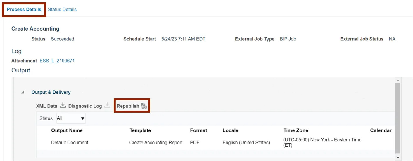 Step 13.    Scroll down to view the Process Details tab. Under the Output section, click the Republish icon.