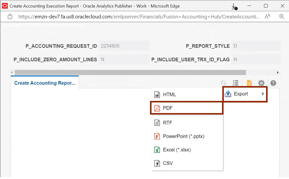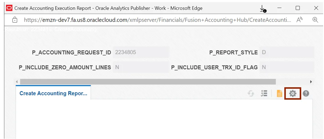 Step 14.    Create Accounting Execution Report page is displayed. Click the Action icon.