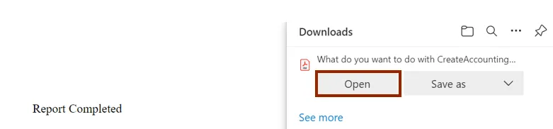 Step 16.    A PDF is generated, and the Report is downloaded. Click the Open button from the drop-down choice list.