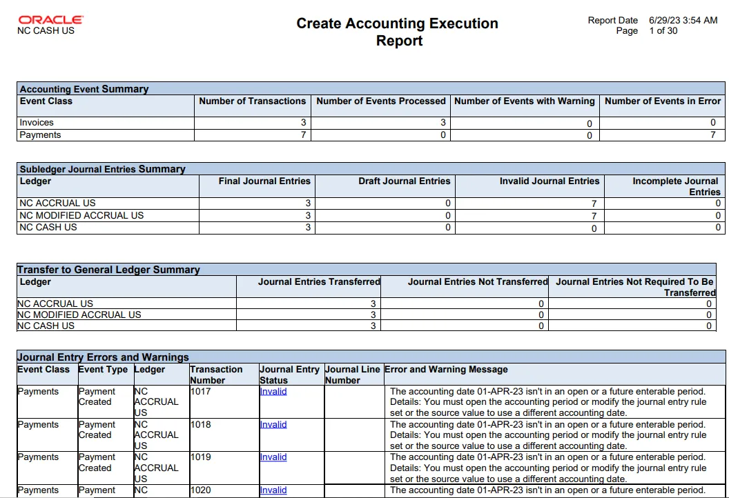 Step 17.    Review the details of the report generated, including any errors that are caught in creating accounting. Fix the issues, if any, and return to the process.