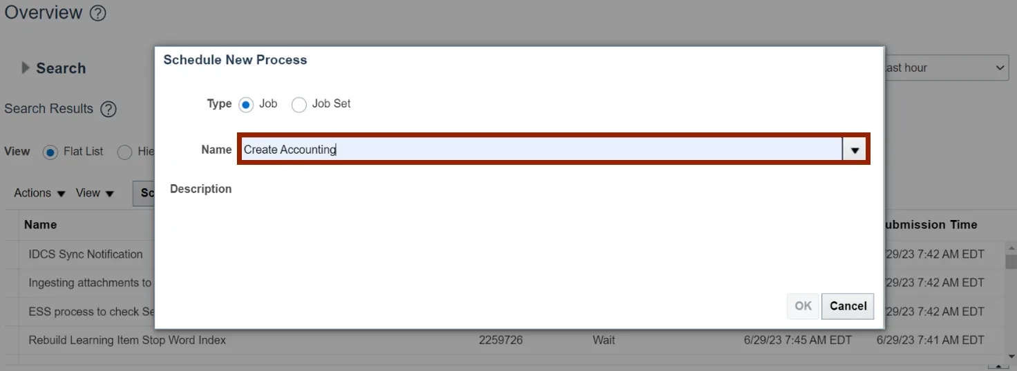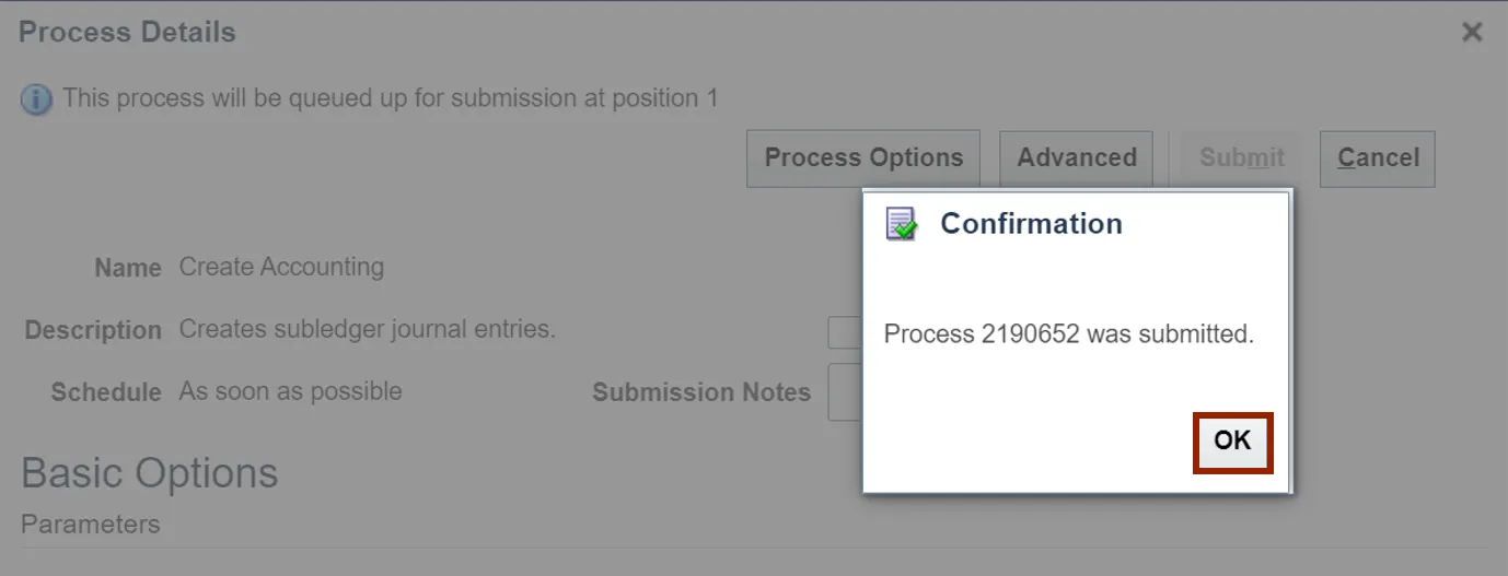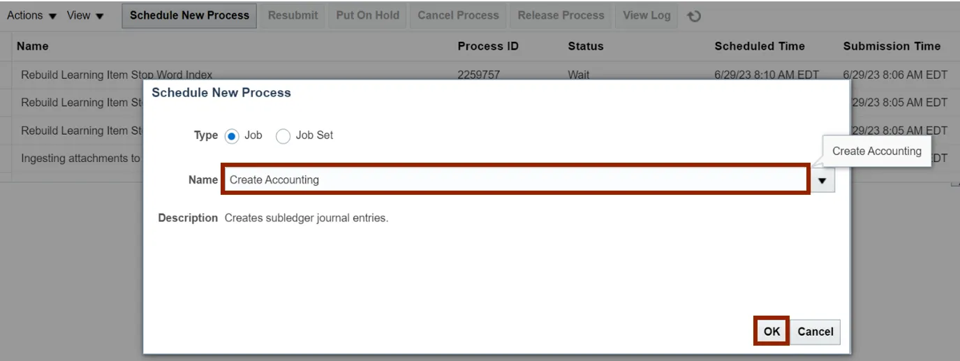 Step 7.    Now, on the Schedule New Process section, Name field is populated with Create Accounting. Click the OK button.