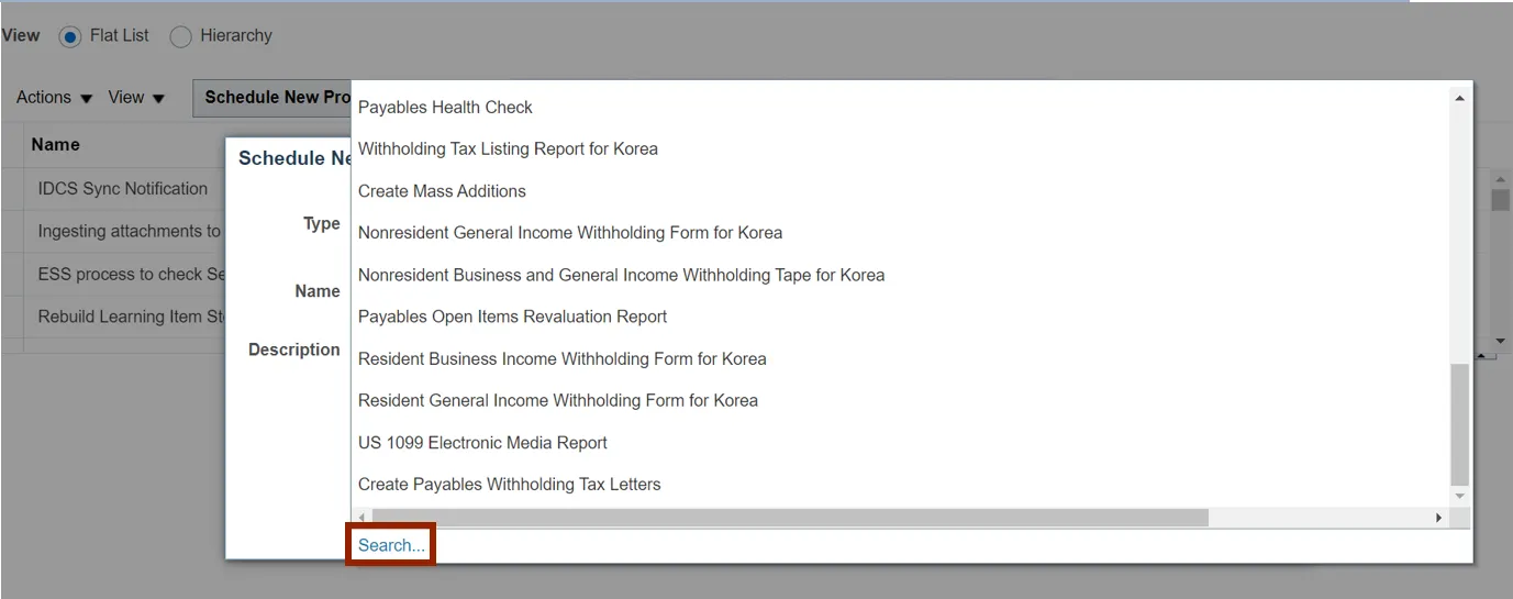 Step 4.    The Schedule New Process pop-up appears. Enter Create Accounting in the Name field and click the drop-down choice list.
