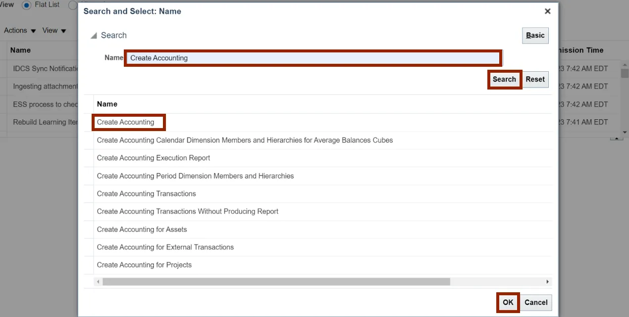 Step 6.    Search and Select: Name section appears. Enter Create Accounting in the Name field and click the Search button. In the Name section below, select Create Accounting and click the OK button.