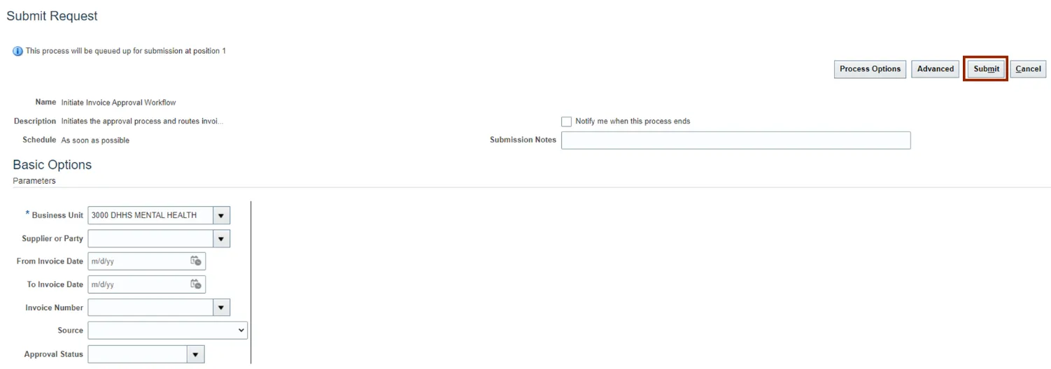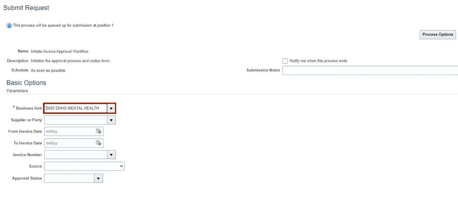 Step 3. The Submit Request page opens. On the Basic Options section, enter the required fields Business Unit.